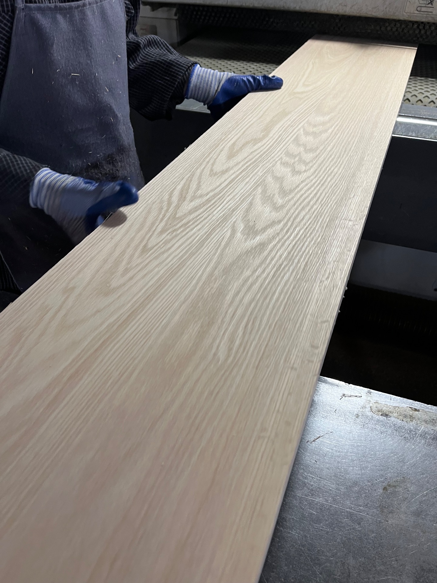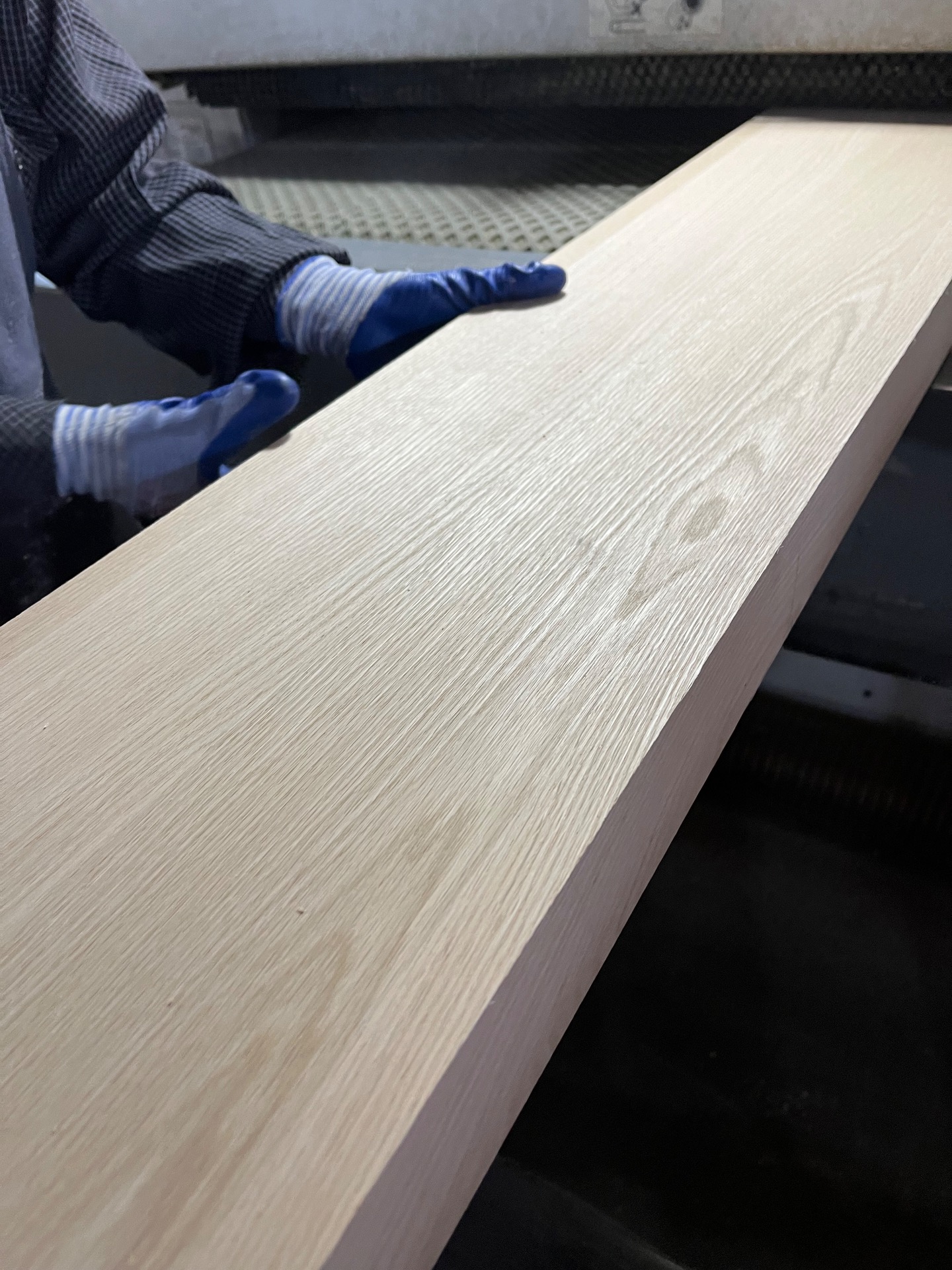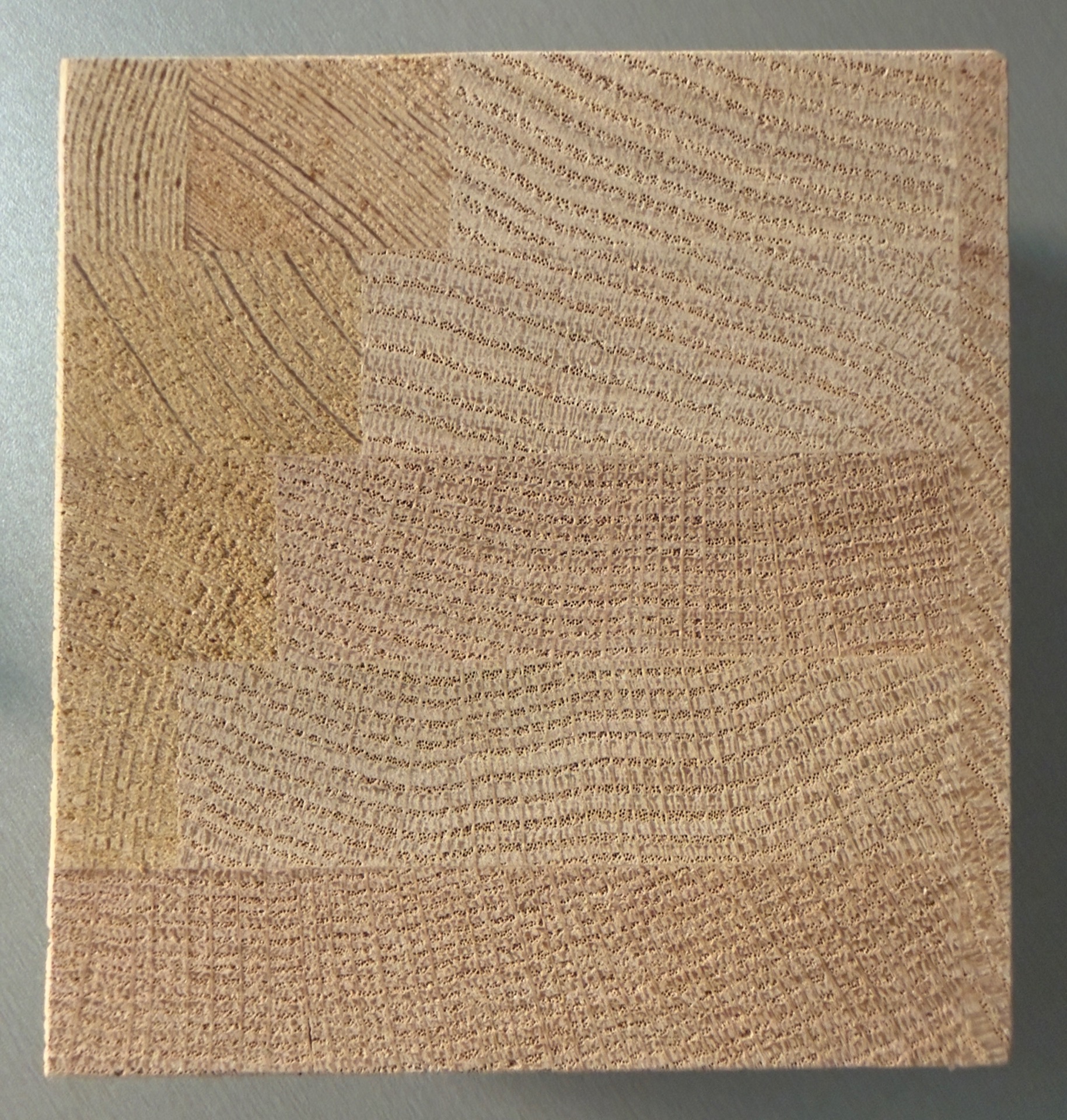 Special 2 species glue-lam. "CL" window scantlings combining SOLID OAK lamellas from on 3 of 4 sides and Larch F/J lamellas. Top and Bottom oak lamellas has 24 mm, side oak lamella is 8 mm or 10 mm thick. Left side consists of several F/J LARCH lamellas.